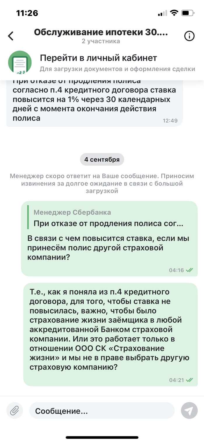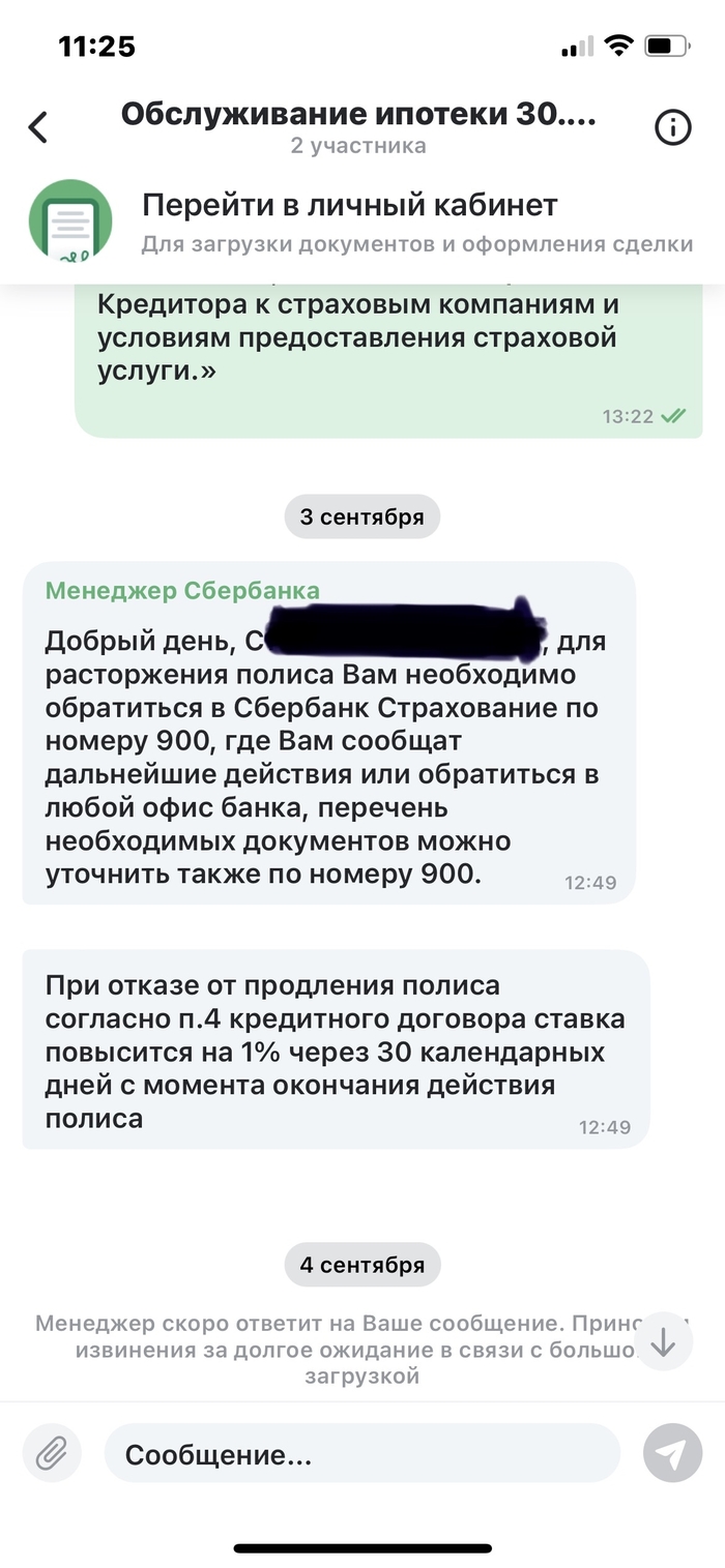 5. Расторгаем договор страхования с ООО СК «Сбербанк страхование жизни». Руководствуясь принципом, что «лучше перебдеть, чем недобдеть», я задаю вопрос в ДомКлике: можем ли мы расторгнуть договор страхования со страховой от Банка и предоставить иной договор страхования; изменится ли ставка по кредиту? Мне отвечают, что договор расторгнуть мы можем, но ставка изменится на 1% в бОльшую сторону через месяц, согласно п.4 общих условий кредитования. Ознакомившись с Общими условиями кредитования на сайте Банка, мы все же решаем рискнуть. Заключаем новый договор страхования и направляем документы в ДомКлик. Осталось дождаться решения Банка. И тут, спустя пару дней, приходит нам сообщение с номера 900, что документы не приняты, так как «наличие/отсутствие полиса страхования жизни не повлияет на процентную ставку по кредиту», по причине того, что кредит выдан без особого условия «Защищённый заёмщик». Получается, что нам очень грамотно Сбербанк (менеджеры Банка) навязал свой полис и до последнего сопротивлялся предоставлять реальную информацию. Вот такое добровольно-принудительное страхование жизни, мать его, у нас вышло. Сегодня идём расторгать договор страхования с ООО СК «Сбербанк страхование жизни». Тем, кто дочитал до конца, лучи добра))) Надеюсь, наша история будет кому-то полезной.
