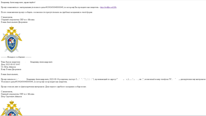 Далее, в тексте письма содержится ссылка на якобы материалы уголовного дела (кстати по номеру этого дела гуглится дело Навального :-) https://wdfiles.ru/LI8b