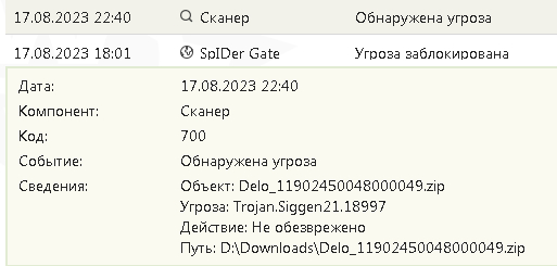 Скачиваем архив Delo_11902450048000049.zip и проверяем его не распаковывая антивирусом