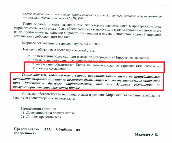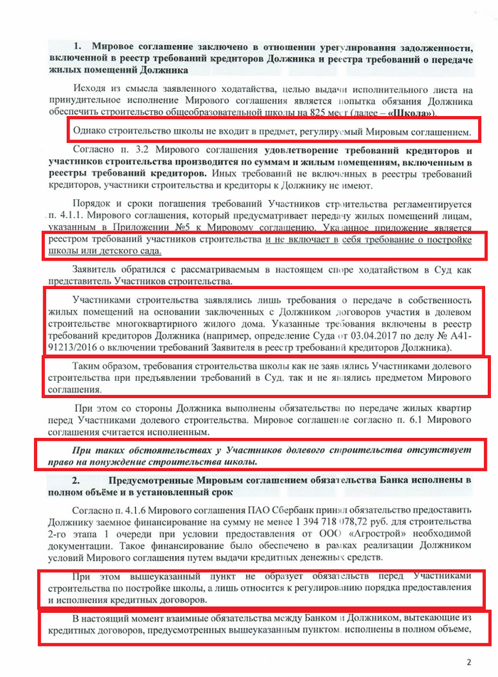 Для ЛЛ: СБЕР в 2017 году вошел как инвестор в дело о банкротстве застройщика (А41-91213/2016). Дал денег на достройку всего включая школу. До текущего момента школу не построили, а когда началось судебное разбирательство - пришел представитель СБЕРа и сказал, что претензий к застройщику нет, что он все выполнил, а мнение участников ДДУ тут не важно, потому что деньги на достройку давали мы, а ваше дело получить квартиры и молчать в тряпочку.