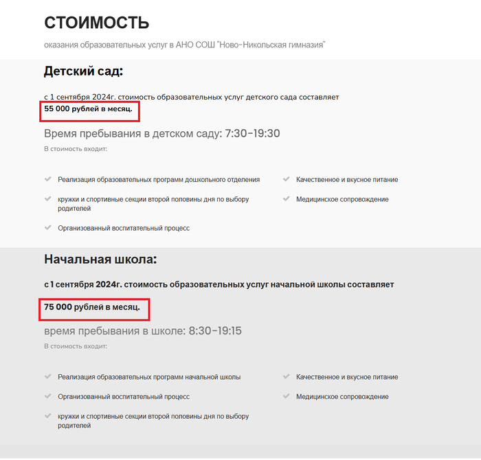 В 2010-2011 году начался сбор денег по договорам ДДУ (договор долевого участия) в строительстве ЖК «Ново-Никольское», где огромные квартиры, закрытая территория с пунктами охраны, своя школа и сад и вообще, буквально рай на земле. Ценник был злой, ЖК позиционировался как бизнес экстра люкс класс премиум эдишен, а по простому «дорогабогато». Люди вложились средствами, набрался пул денег и началась стройка, но в 2014 году, застройщик сказал, у меня лапки, денежек больше нет – я банкрот. В процедуру банкротства привели за ручку СБЕР, который дал денег на достройку (кредитных естественно), а в ответ вся недвижимость сначала выкупается у СБЕРа, а потом перепродается (только в ипотеку СБЕРа, да на старте продаж после достройки в 2020 нельзя было купить за нал, только ипотека и только СБЕР). И мы получаем квартиру, которую только что сдали, но она идет как вторичка (1 сделка купли-продажи от СБЕРа застройщику, а потом от застройщика вам) и вот уже ипотека с повышенной процентной ставкой. Фактически дома были сданы в ноябре 2019 года и жители начали заселяться. Я приобрел тут квартиру в 2020 году, ремонт закончил в 2021 и после въезда стал задаваться вопросом, а где школа и садик. А садик оказался частным с вот такими ценниками