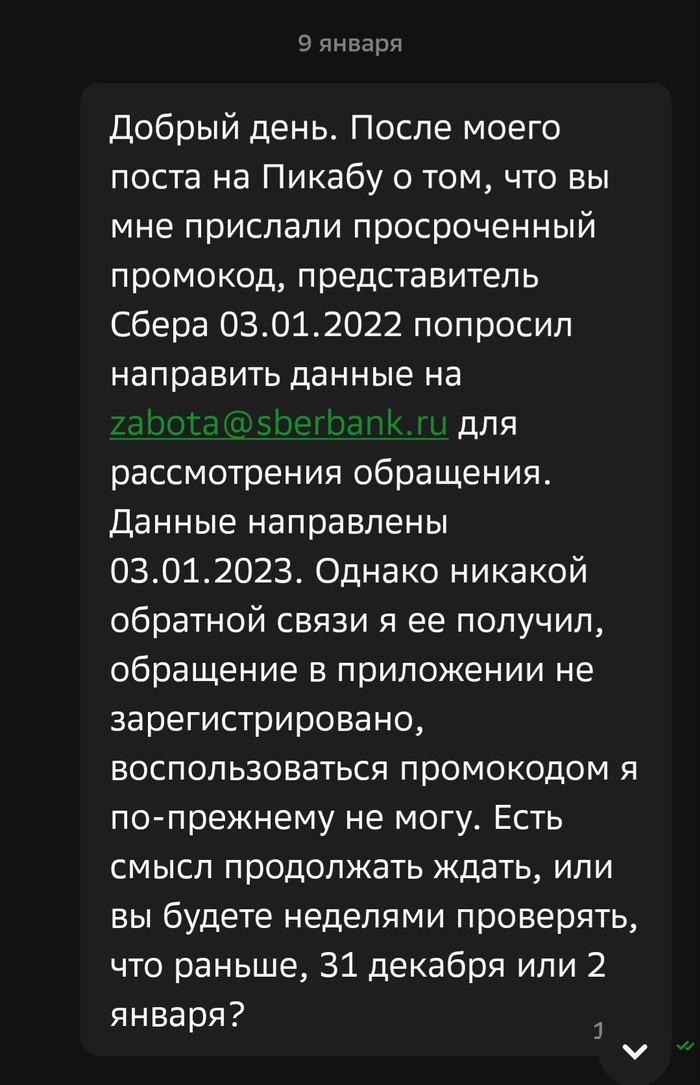 У меня есть предложение к менеджерам Сбера: если вы все равно рассылаете просроченные промокоды, делайте скидку побольше. Можете и 5000 скинуть, и звучит красивее, и затрат никаких.