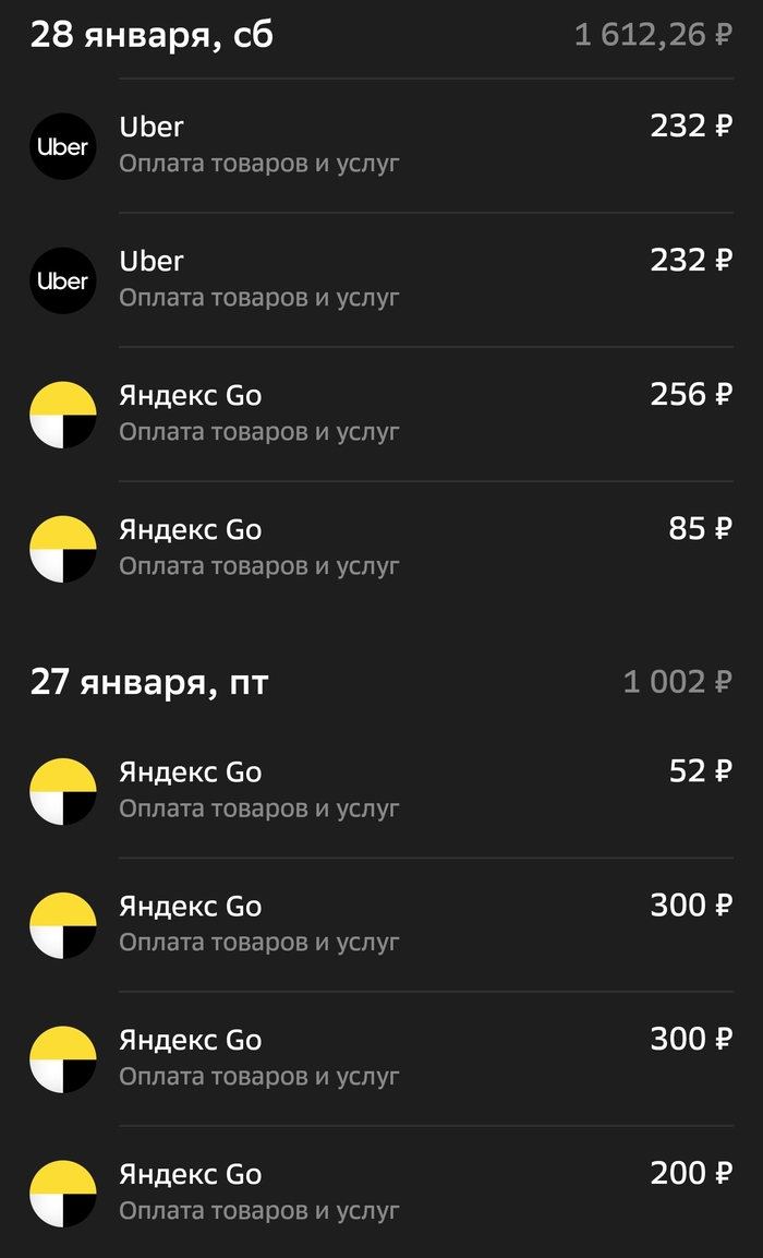 1) списания с убера и @Yandex.Go, выглядят очень ровными суммами. Когда вы видели такси, стоимостью ровно 300₽ ?