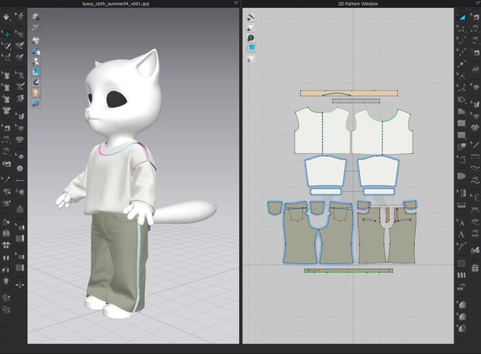 Хоть Куся и кошка, но все-таки девочка-подросток. Поэтому теперь может менять образы в режиме реального времени. Цифровая одежда полностью повторяет материал и физику обычной ткани. Выкройка каждой вещи уникальна, команда снимала мерки, учитывая при этом состав материала, облегания, швы и приспуски — как в реальном ателье. Затем раскладывали выкройки, учитывали застежки и пуговицы, а потом переходили к «пошиву» и выбору цвета. Готовые элементы регулировали по посадке!