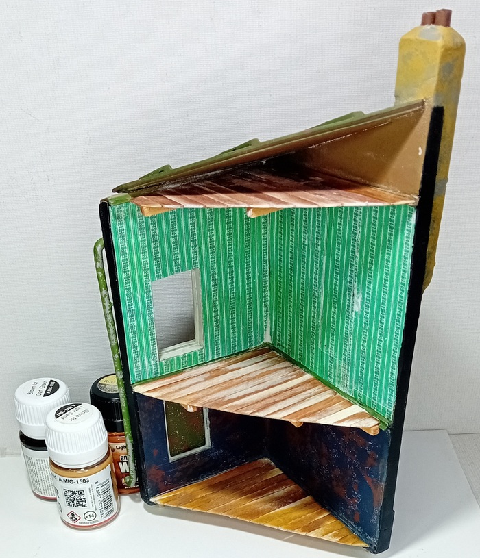 В следующем этапе работы я перешел к покраске. Сначала задул дом в два оттенка. Коричнево-кирпичный в зонах, где штукатурка осыпалась до кирпича и в каменно-серый там, где краска и штукатурка на доме осталась, крышу покрасил в бордовый выгоревший цвет. После высыхания краски применил солевой метод, на слегка смоченную поверхность я фрагментами посыпал обычную крупную соль и как только она высохла задул дом в четыре цвета. Фундамент в серо-синий, первый этаж в рыжий, второй в желтый, а крышу в зеленый. Мое мнение, что чем ярче будут выбраны цвета для архитектуры, тем выигрышней диорама будет смотреться после тонировок, захватывать взгляд зрителя и не будет казаться монотонно темной. После высыхания краски я аккуратно кистью стер соль (на фото видно, что местами соль все таки осталась, но и ее я впоследствии удалил ватной палочкой) вместе с верхним слоем краски и дом стал выглядеть значительно более обшарпанным временем и войной. Для привязки дома к географической местности - а это Запад Германии - я добавил от руки белой темперной краской надпись, которую порой можно было встретить на фото в немецких городах. Она простая и понятная - "1918 год?.. Никогда!". С внутренней стороны дома приклеил модельные обои на клей ПВА и сформировал деревянный пол в два слоя между этажами и чердаком.