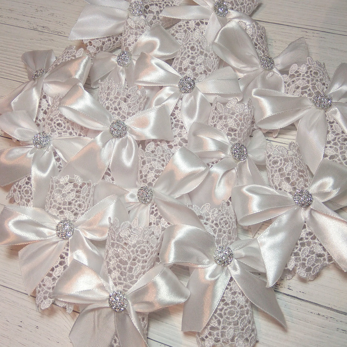 Дальше кружево и лента. Всё должно быть в тон или подходить по цветовой гамме (в зависимости от пожелания, конечно же, заказчика и цветов свадьбы). У нас всё белое. Выбрали:)