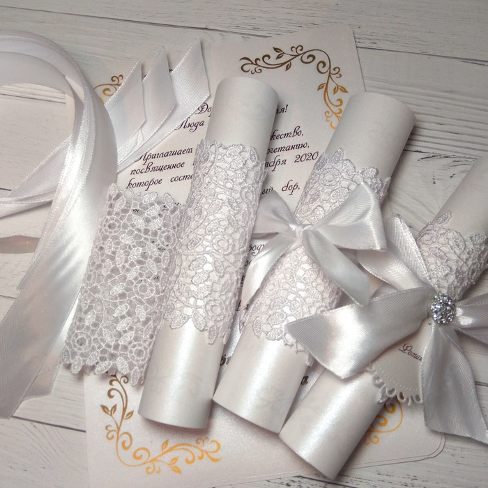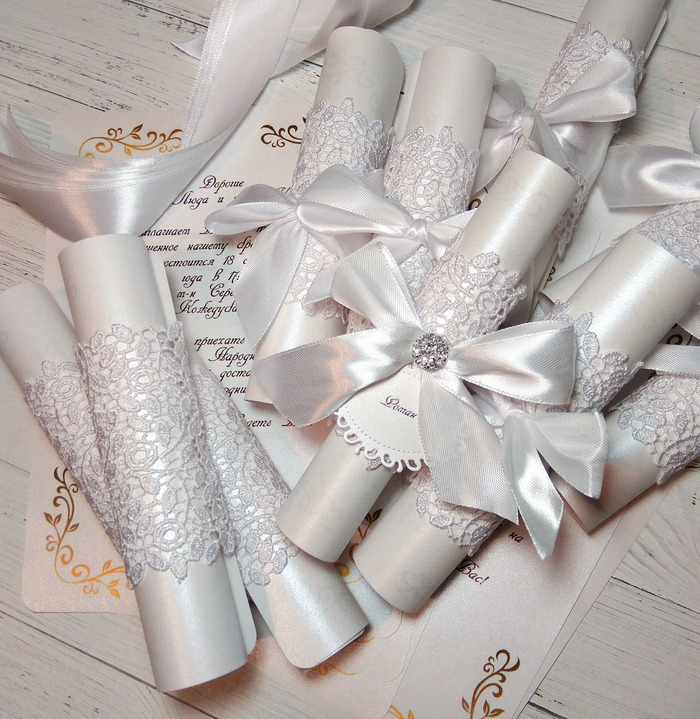 Немаловажным моментом в пригласительных идёт выбор бумаги. Ни в коем случае не экономьте и не печатайте на простой или дешёвой! Это сразу бросится в глаза. Выбрали достаточно плотную (125гр), но чтобы нормально скручивплась в рулон. Красивая, белая, с жемчужным блеском.