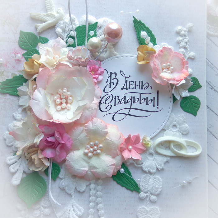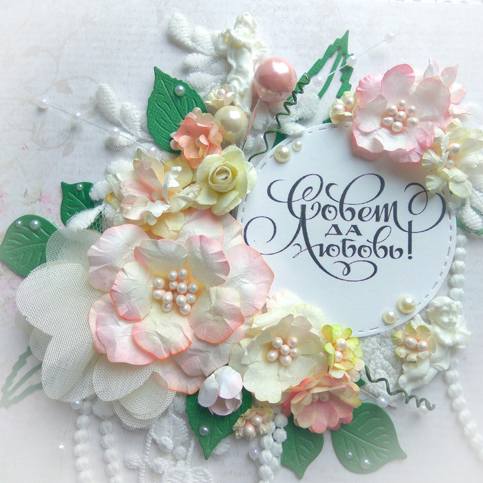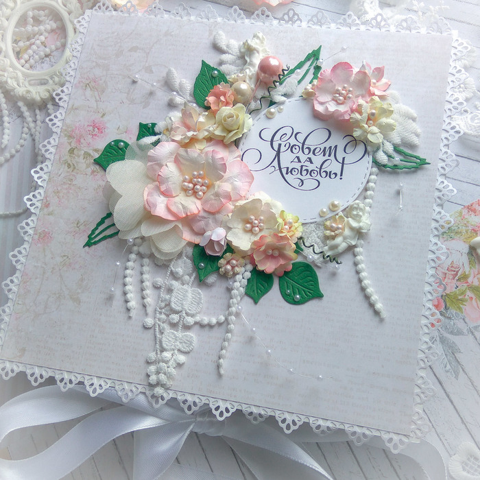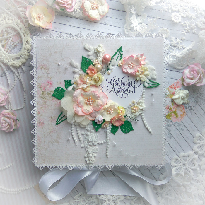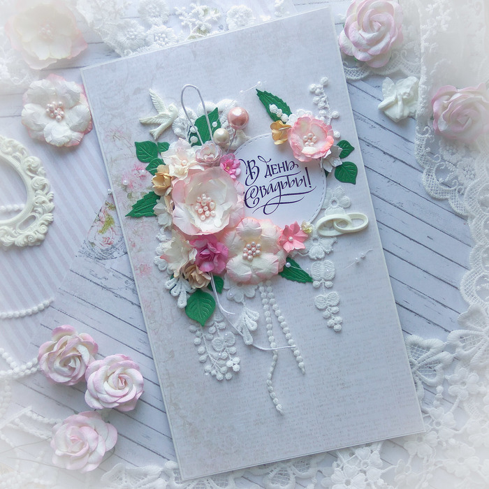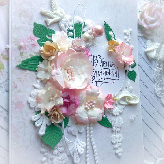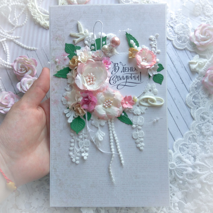 Пришел заказ на коробочку для денег и открытку в одном стиле. Цветовая гамма не белая, не розовая, но розоватая и кремово-бежевая, ну или типо того. Коробочка 18х18х4 см, а открытка 15х25 см. Ну и там всякие остальные детали, типа много цветов, кружево, рюшечки по краям коробки и пр.