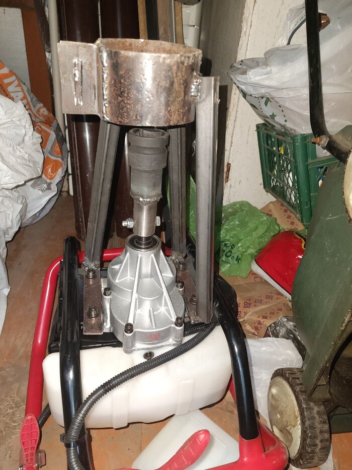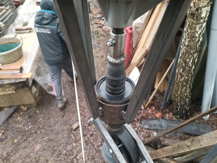 Теперь на эту конструкцию надо поставить бур. При работе его трясет, и получается большая нагрузка на сам вал — требуется закрепить всю конструкцию на одной оси. Для этого собираем треногу крепления бур-гайковерт (трубки приварены к стальной площадке и прикручены к ручке бура, от бура идут к гайковерту, там трубки приварены к кольцу из надрезанной трубы, надетой вокруг гайковерта). P.S. По итогу жестко крепить к гайковерту ее не стали, так как удобнее переставлять всю конструкцию отдельно.