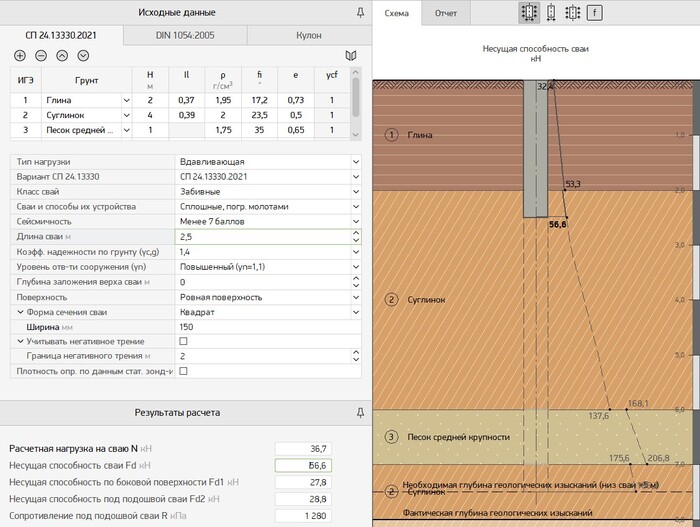 Переносим данные из геологического отчёта в расчётную программу, указывая параметры железобетонных свай, получаем несущую способность одной сваи 3,7 тонны. Понятно, что нагрузка распределяется не равномерно, каждая свая будет испытывать разное давление, но полученный запас надежности 130% позволяет пренебречь этим фактом.