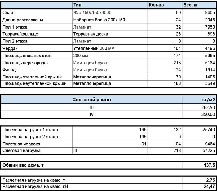 Расчетный вес дома с учётом всех нагрузок, в том числе снеговой, ветровой и полезной нагрузки получается 137,5 тонн, делим на количество свай и получаем, что на одну сваю приходится 2,75 тонны нагрузки.