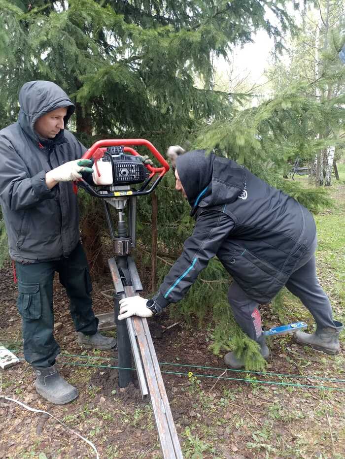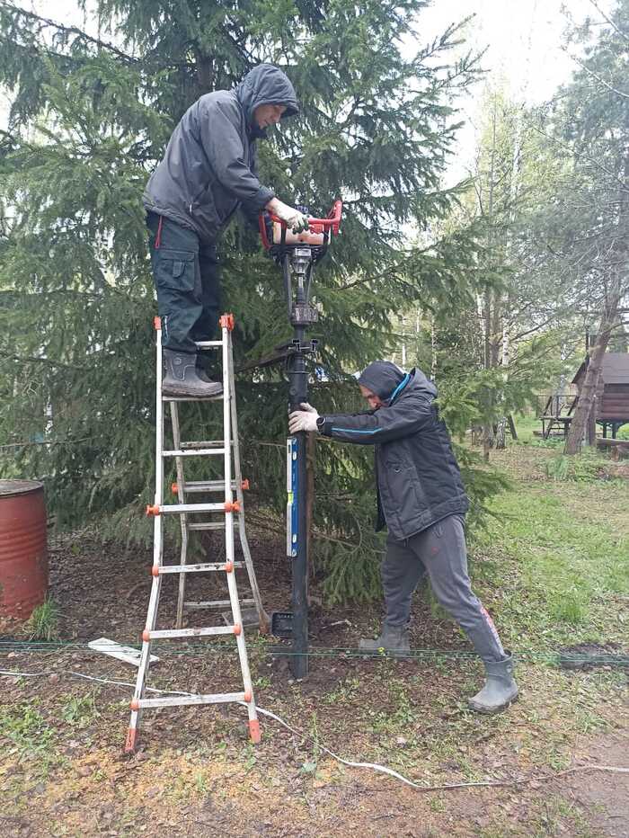 После сборки устройства его необходимо протестировать. Для этого берем: лом, лопату, стремянку, помощника, сваю и сам сваекрут. Выбираем место для будущей сваи, снимаем дерн (пара сантиметров земли), размещаем сваю на подготовленное место и вручную (ломом) подкручиваем ее, чтобы зафиксировать вертикально. Далее со стремянки устанавливаем всю конструкцию на сваю и жмем на газ.