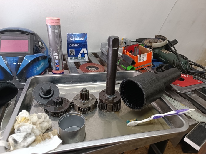 Требуется заменить заводское масло в редукторе. Для этого снимаем стопорное кольцо и вытаскиваем содержимое (собрать обратно возможно только одним способом — можно не запоминать), промываем зубной щеткой или тряпкой с бензином и плотно мажем жаростойкой смазкой.
