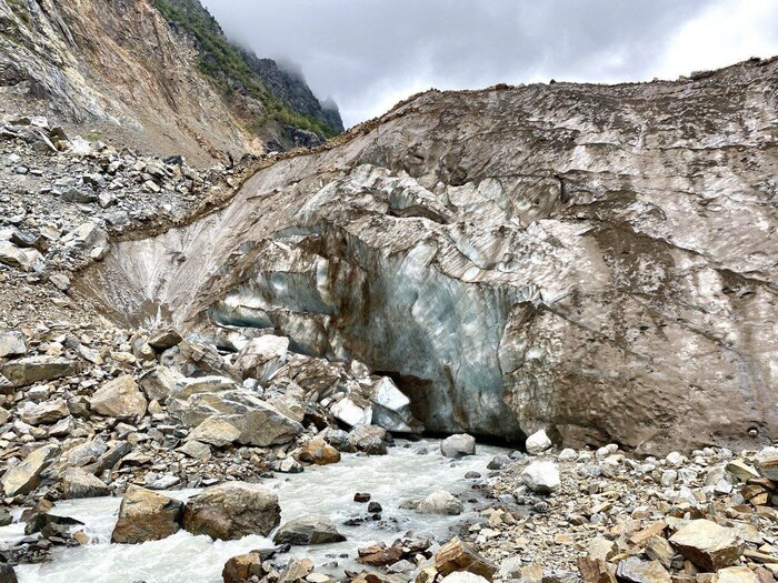 Вышли к скалам, растительность сразу «занизилась». Катя махнула, что нам надо куда-то за перегиб, к моренной осыпи. Однако перемещение – по крутым зеленым полкам, либо вообще по кулуарам, расточенным ручьями. В итоге каждая ходка – медленная и не самая безопасная. Сначала забраться на дерьмовый конгломератный склон, где даже ступени не выбьешь, затем траверснуть по крутой зеленой полочке (с огромным рюкзаком, ага), потом забираться по сырым камням.