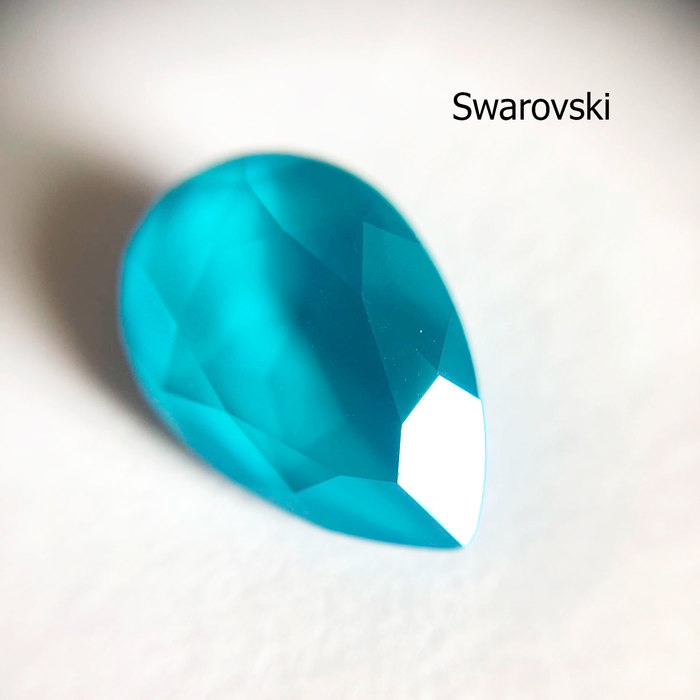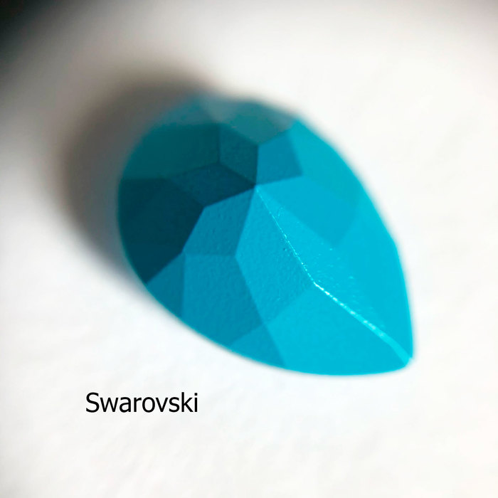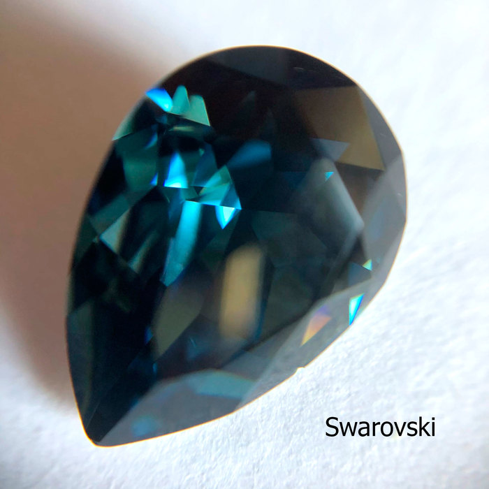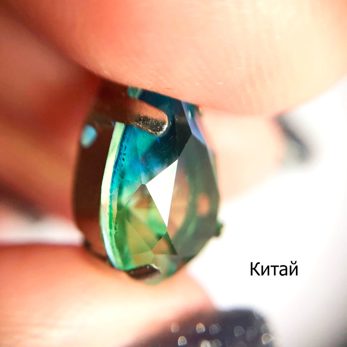 Начнём с капель под оправы. В первую очередь смотрим на лицевую сторону кристалла, в идеале все грани должны быть идеально ровными. Сваровски, без сомнения, могут здесь являться эталоном, к ним ни одной претензии. Так что сразу взглянем на остальные капельки. Чехия на первый взгляд кажется идеальной, однако у широкой части я всё-таки нашла до чего докопаться, в паре мест кристалл несколько кривой. Впрочем, взяв в руки изумрудную каплю вместо синей, я этого недочёта не нашла, так что спишем на редкий брак, который если и встречается, не является основополагающим в качестве.