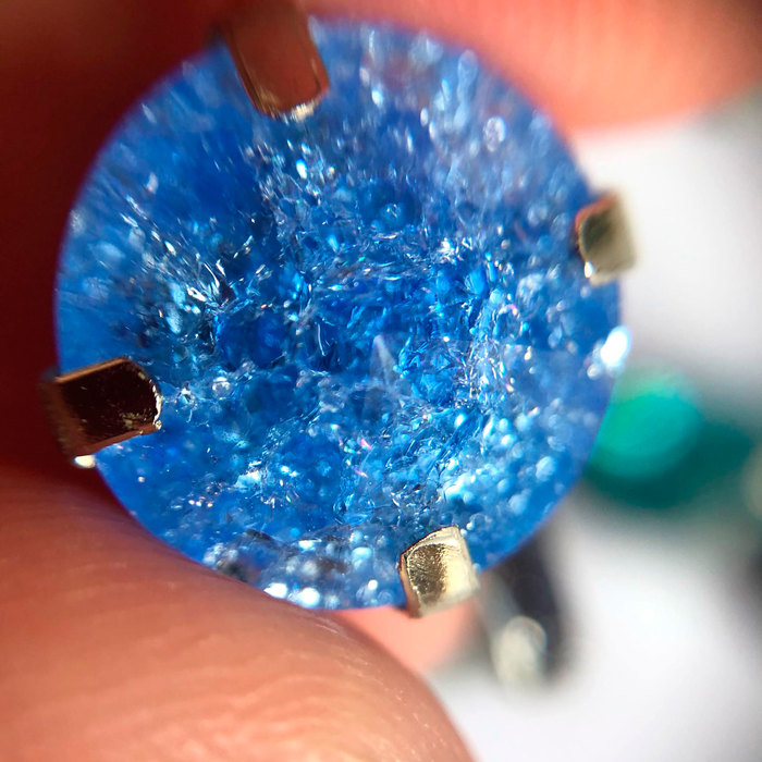 В частности хочу указать два довольно важных нюанса — один из китайских кристаллов мне пришёл «полосатый», видно место окраски (разумеется, технология окраски китайский кристаллов немного кустарнее, чем тех же Сваровски). Но если этот брак может сыграть на руку в работе, то брак одного из чешских кристаллов, пузырь внутри стекла, просто недопустим, на мой взгляд. А ещё обнаружила нюанс окраски в китайских матовых кристаллах, но важно — я его обнаружила только в макро, без многократного увеличения он никак не влияет на общее впечатление
