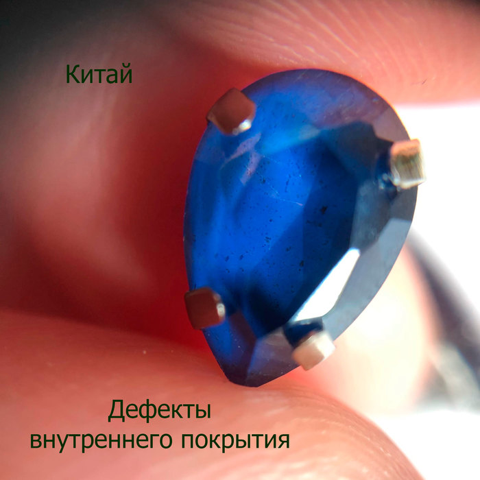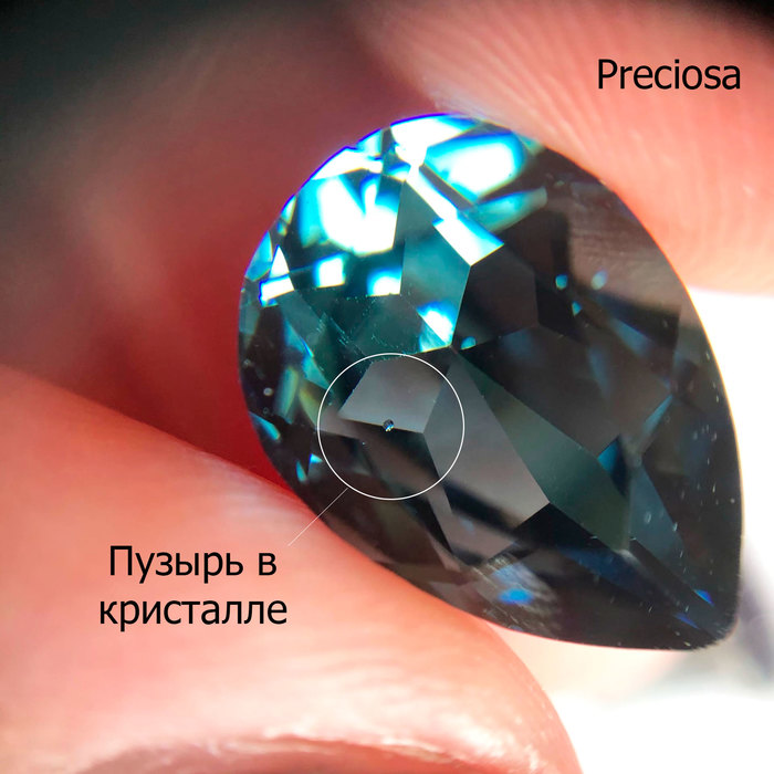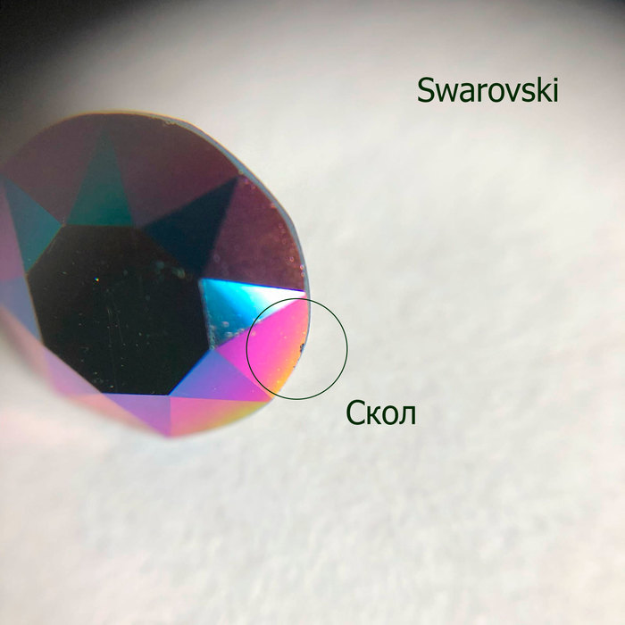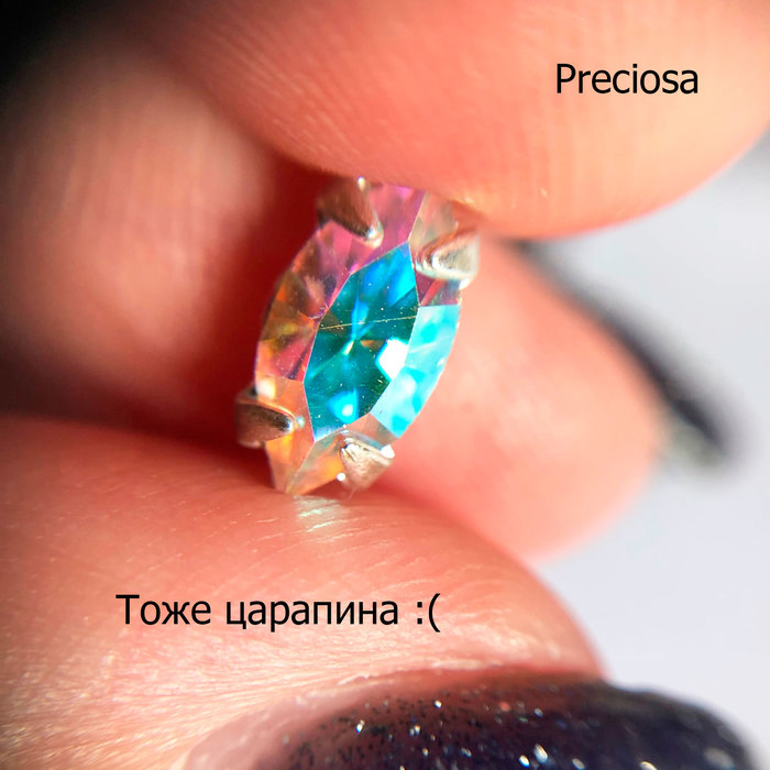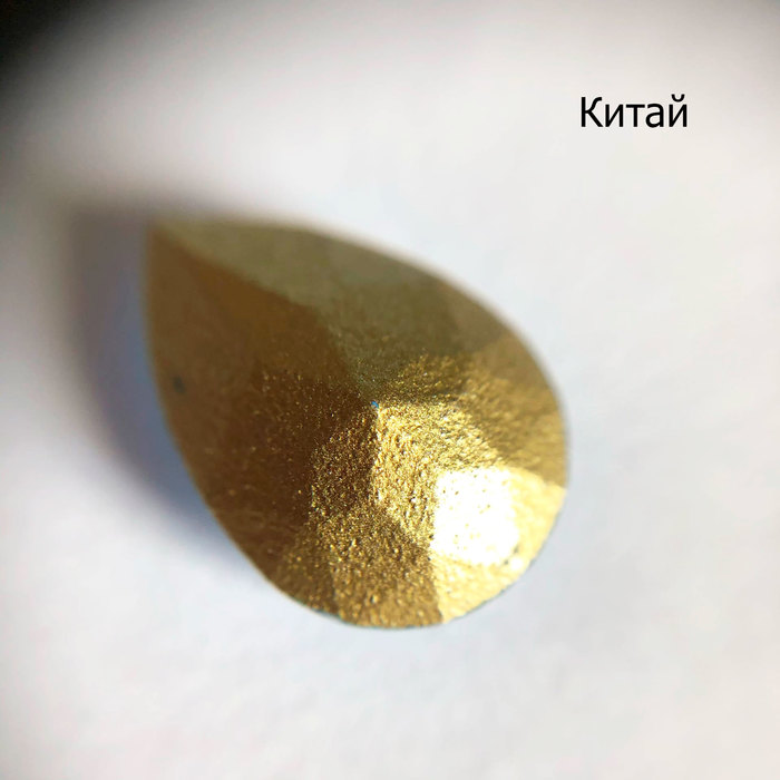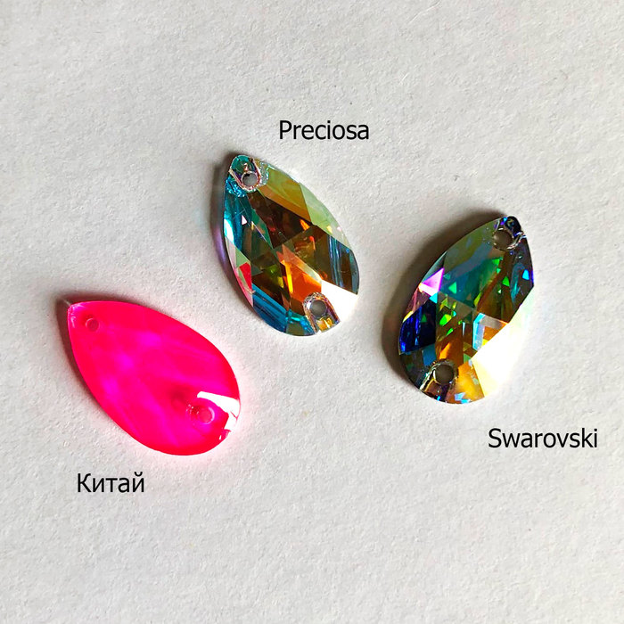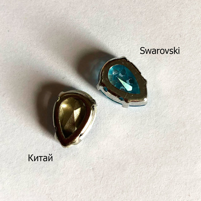 В качестве «подопытных» возьмём всё те же капли под оправы. Сваровски и Прециоза мало различаются визуально, однако заметно, что слой покрытия у Сваровски несколько толще. В китайской же версии как будто краской мазнули. Кстати, на этом кристалле уже можно наблюдать царапины, но они недостаточно глубокие, поэтому не влияют на внешний вид кристаллов.