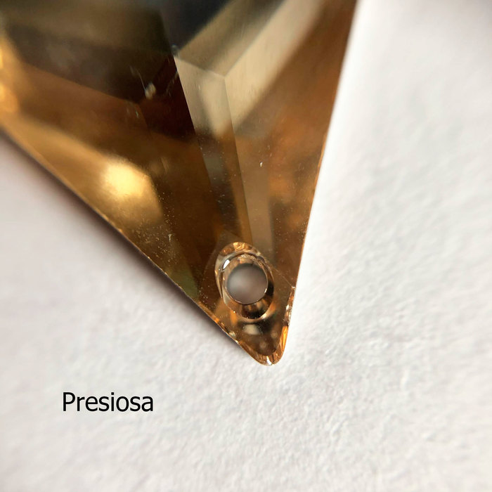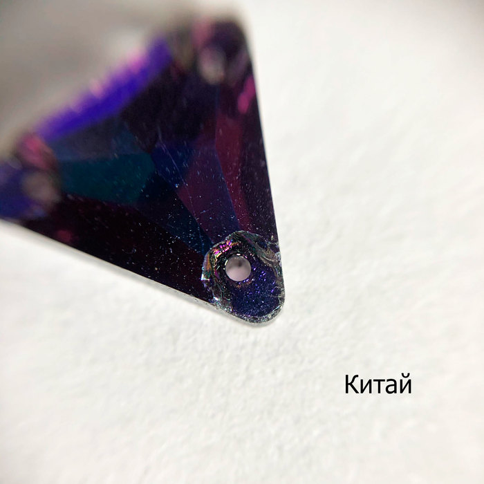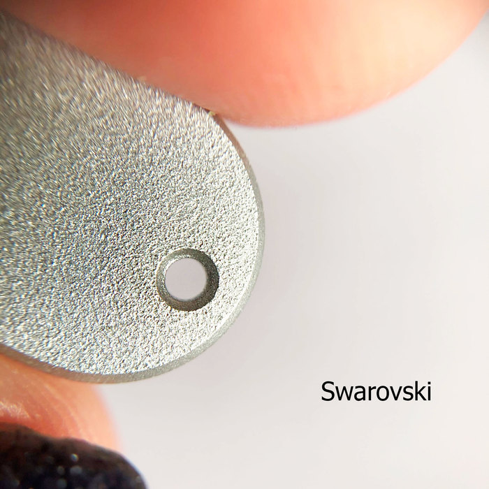 Начнём с отверстий. У Сваровски они находятся на одинаковом расстоянии, дорожки к ним идеально ровные, без сколов. У чешских кристаллов на треугольнике вообще оказалось не предусмотрено пресловутых дорожек, просто скошенные края, не все ровные, края отверстий обработаны плохо — особенно хорошо это видно с изнанки. Китайские кристаллы же порадовали аккуратностью отверстий, чего не скажешь о выемках-дорожках, там всё довольно хаотично, присутствуют сколы и общая неаккуратность (особенно на треугольнике).