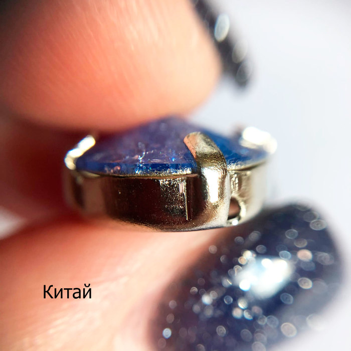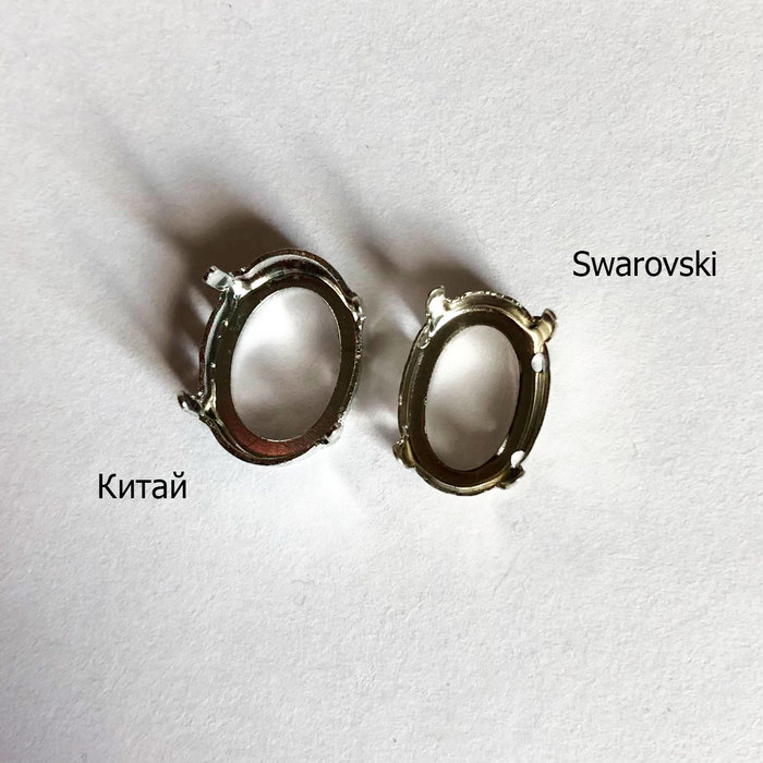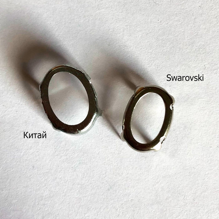 В первую очередь у них немного разная форма. Китайские более округлые, внутреннее отверстие также различается. Также у китайских оправ более крупные отверстия (что мне, впрочем, играет только на руку) и более длинные крапаны (это хорошо видно, когда кристалл уже закреплён). Про высоту оправ я не буду говорить, потому что у Сваровски они бывают разные, какие-то высокие, какие-то низкие, зависит от высоты самого кристалла, но у Сваровски есть ещё одна фишечка — верхняя часть крапана в подавляющем большинстве оправ слегка изогнута. Таким образом, зачастую крапан ложится прям чётко по форме кристалла, максимально прилегая к нему. Что, впрочем, иногда выглядит даже странновато, потому что ощущение, что кристалл держится на соплях и магии. Но он сидит крепче крепкого :)) К сожалению, такие оправы у меня уже все на кристаллах, так что показать толком не смогу