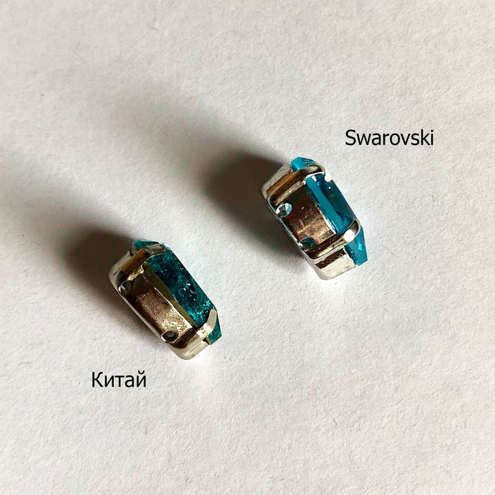 Все три производителя слегка отличаются по цвету, однако Чехия и Китай идентичны на 99%. Сваровски же имеют более бирюзовый оттенок, который отчётливо видно в искусственном свете. В естественном свете все кристаллы становятся полностью идентичными. Хотя забавно — как я ни билась, камера видит разницу в цветах даже в естественном освещении. Точной теории о причине подобного изменения у меня нет, но предположу, что дело в цвете фольгированного покрытия. Снаружи он весь одинаковый, но, вероятно, под стеклом немного разный оттенок, у Китая и Чехии более желтоватый, что даёт более тёплый оттенок кристаллам, у Сваровски более чистый серебристый.