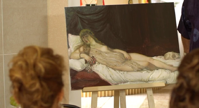 Художник демонстрирует картину, которую писал с натуры главной героини. Сцена происходит в помещении. Стиль изображения картины - классика (условно).