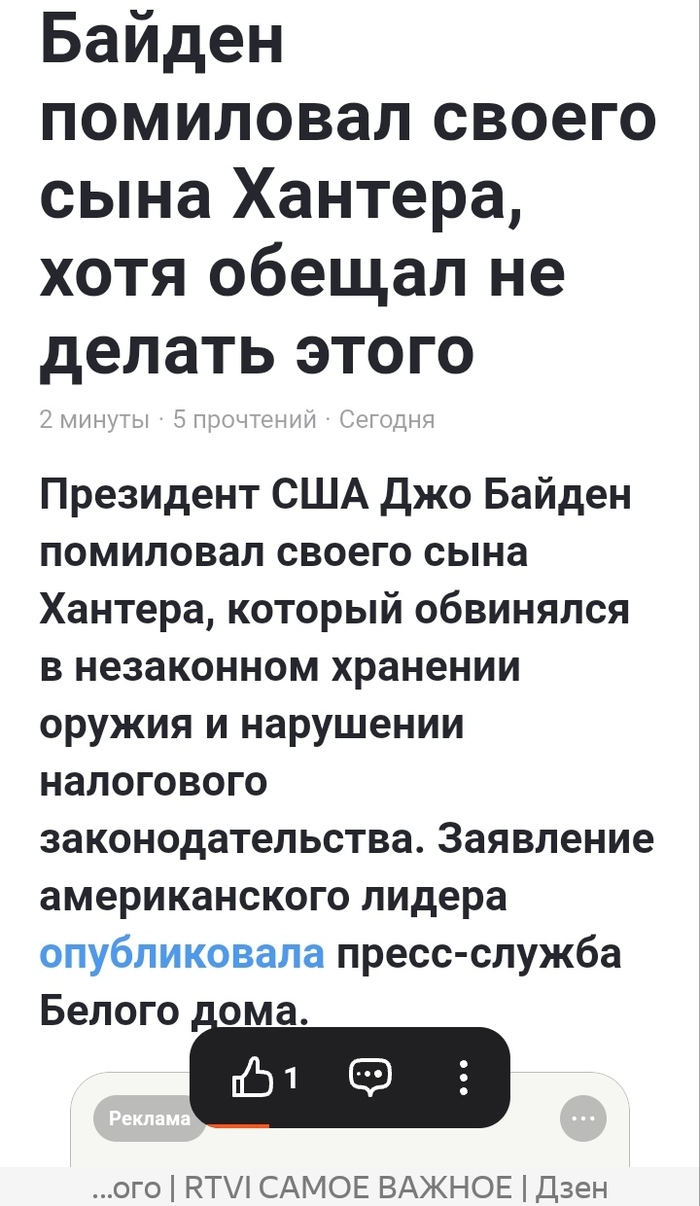 Сына президента обвиняли по двум уголовным делам, по первому его признали виновным присяжные, по второму он сам признал вину. Байден-старший назвал преследование политически мотивированным и посчитал, что американцы поймут его шаг