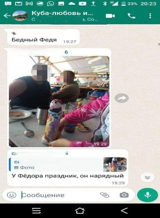 Самсонов утверждал, что перестал ездить в лагерь за год до того, как там появился фаллоимитатор. По его данным, это произошло летом 2019-го. Предмету дали имя — Федор Семенович Чпок. На одной фотографии из чата лагеря в WhatsApp, которую адвокаты политика заверили нотариально, видно, что за одним столом с секс-игрушкой сидели и дети, и взрослые. Самого политика на этих фото нет, а переписка и показания очевидцев говорят о том, что его не было в лагере в 2019 году.