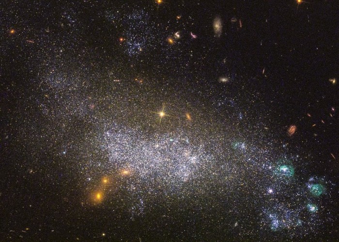Карликовая галактика DDO 68 (UGC 5340), расположенная на расстоянии 40 миллионов световых лет от Млечного пути. В правом нижнем углу изображения можно увидеть целую россыпь молодых и горячих светил. По мнению астрономов, всплеск звездообразования в
