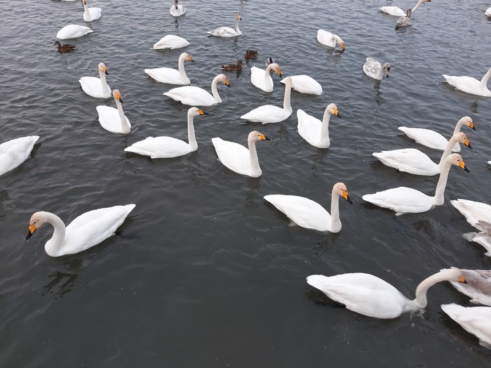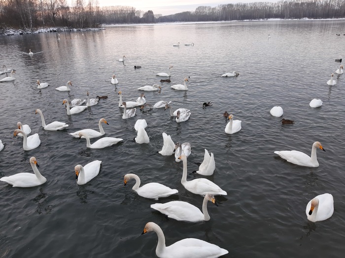 Вместе с лебедями там гостят и утки. Шумная компания.. :-)