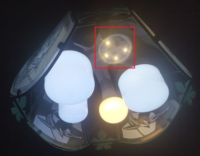 Тестируем в одной люстре. Рядом кстати лампочки на 15 и 20Вт, купил на пробу, не уверен что долго проживут.