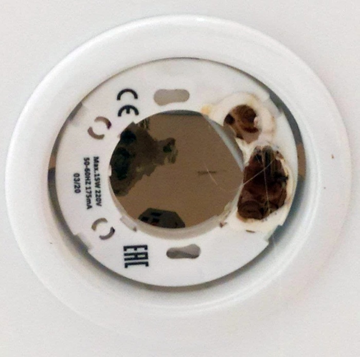 Лампочки из пластика. Плата на которой расположены светодиоды из картоноподобного генитакса, не стеклотекстолит и не алюминиевая плата. Светодиод выходит из строя, увеличивает сопротивление и начинает сильно греться, проплавляя пластик. Внутри всё дымит под подвесной потолок, думаю несколько дней процесс шел. Снаружи всё выглядит хорошо, остальные светодиоды даже продолжают светиться на 5% яркости.