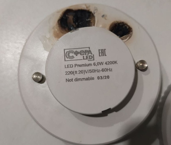 И обратный пример, дешевые лампочки в составе потолочных светильников (формат GX53), вот их не то что ремонтировать нет смысла, их имеет смысл выкинуть, они пожароопасны. Из 20 штук за пару месяцев работы 5 штук не просто перестали работать, они оплавились и завоняли квартиру. Фото со снятым светорассеивателем:
