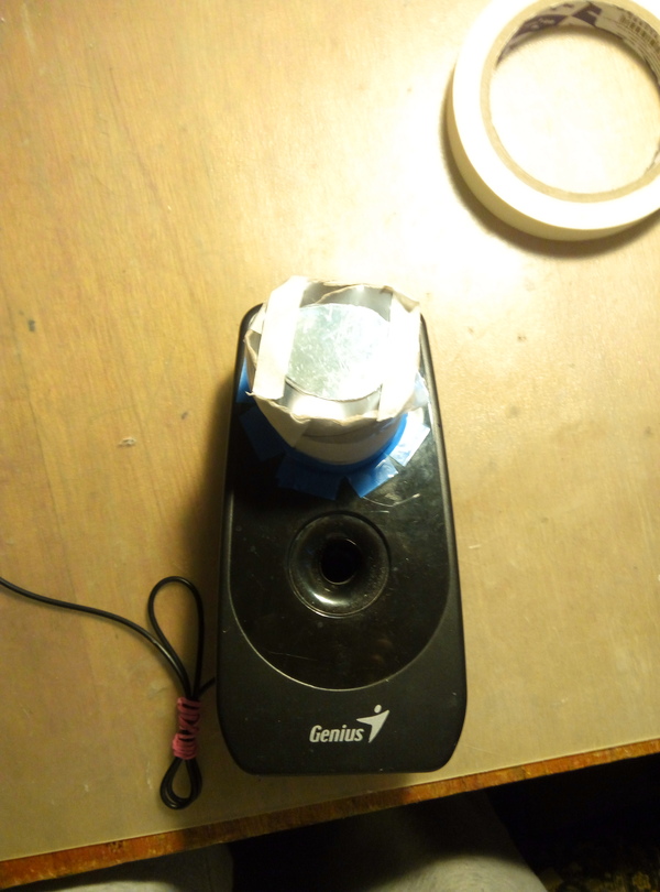 Теперь эту конструкцию клеим к колонке. При этом желательно снять сетку, закрывающую динамик(если она есть)