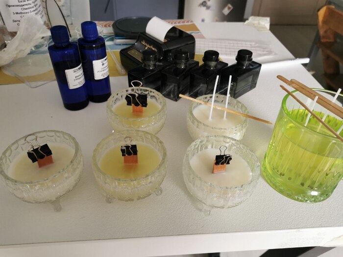 Посмотрела ютубчик, заказала какой-то говняный воск(кто же знал что там куча подделок и надо знать проверенных поставщиков), взяла первую попавшуюся "отдушку для свечей". Получилась дикая вонючка, которая еще и коптила постоянно.