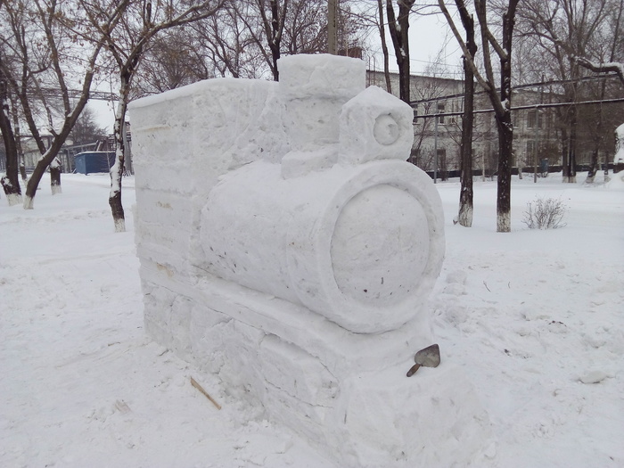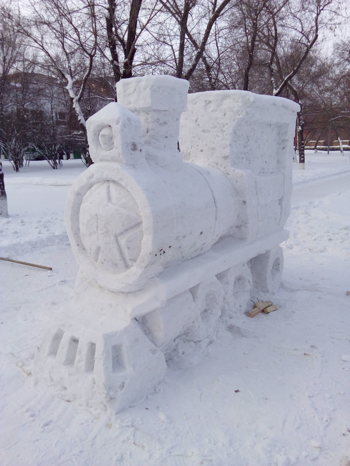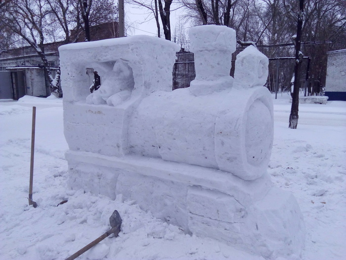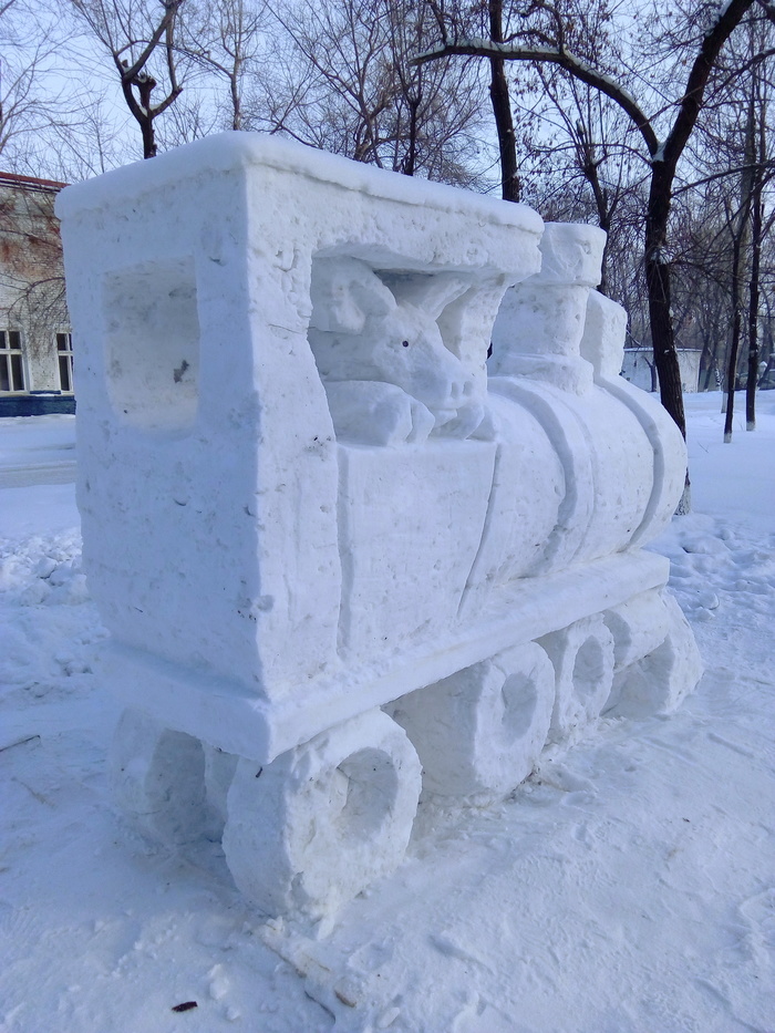Снежная фигура - "Паровоз, управляемый свиньёй"...