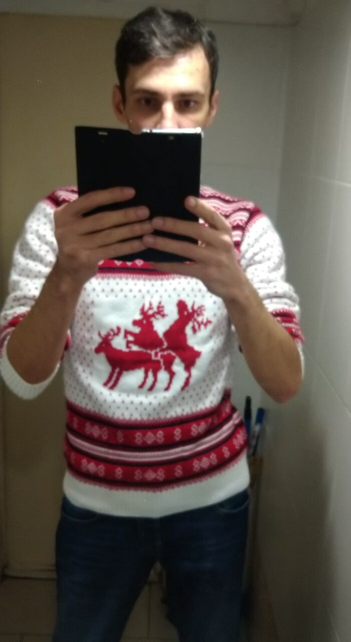И прямо загорелся им. Ну шикардос же) И настроение зимнее и новогоднее, и свитер клёвый, и рисунок на нём с классическими оленями.