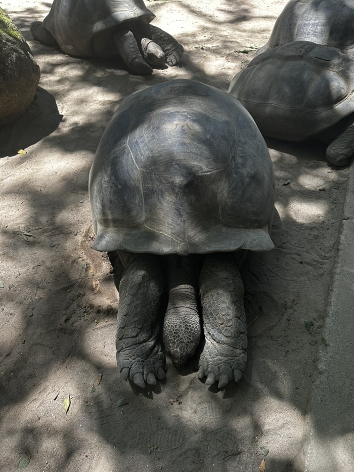 Ехать в автобусе по серпантинистым дорогам стоя – опыт, который, пожалуй, я не советую никому, ибо по ощущениям тебя помещают в шейкер и трясут там! Не без труда и лёгких травм мы доехали до нужной остановки. Вышли на остановке «Ботанический сад» и заплатили 500 рупий за вход. Погулять интересно, останавливаться в тени деревьев не стоит, так как в режиме «стелс» мы были искусаны комарами… когда и в какой момент они садились попить нашей кровушки было непонятно, но последствия их «приземлений» ощущались долго и выглядели не очень. В саду есть площадка с черепахами. Местный смотритель бесплатно снабдил нас вкусняшками и показал, как черепах гладить. Прикольно!