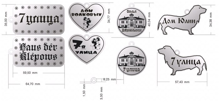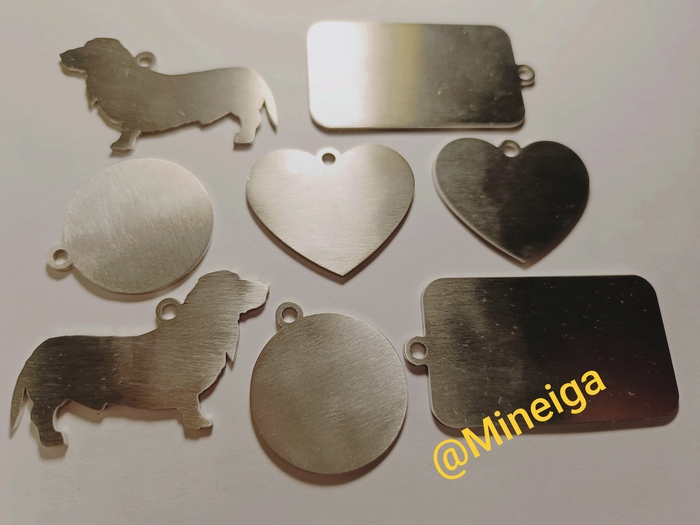 Дизайн и порезать на лазере, ждет отправку, кроме собачек. Нерж сталь 304я немагнитная 2мм. Далее будет лазерная гравировка черным. Собачки, остаются у меня) На них могу Вам что-нибудь сделать, надпись в глубину с эмалью.