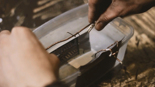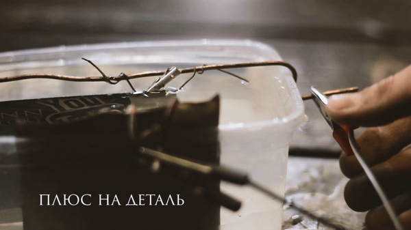 Устанавливаем оба электрода (катод (минус)- корпус; анод (плюс)- деталь) в солевой раствор друг напротив друга. Я делаю это вертикально, чтобы образующийся налет не скапливался на заготовке. Электроды не должны касаться друг друга напрямую. ВАЖНО! Катод должен быть такого же размера , как и деталь. Это необходимо для равномерного травления.