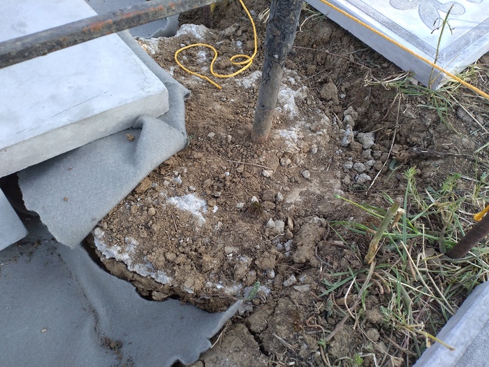 Это дорога и на ней лужа. Которую планировалось засыпать вынутой землёй и привезённым песком. Могилка слева, чёрное надгробие, между синим металлическим памятником и синей оградкой. Плита под памятником слегка отклонилась от уровня, но было решено плоскость площадки делать, как продолжение плоскости плиты, чтобы плитку потом не под углом к плите ставить и чтоб плита не выступала за уровень плитки. (Спойлер: потом увидите, на что это повлияло)
