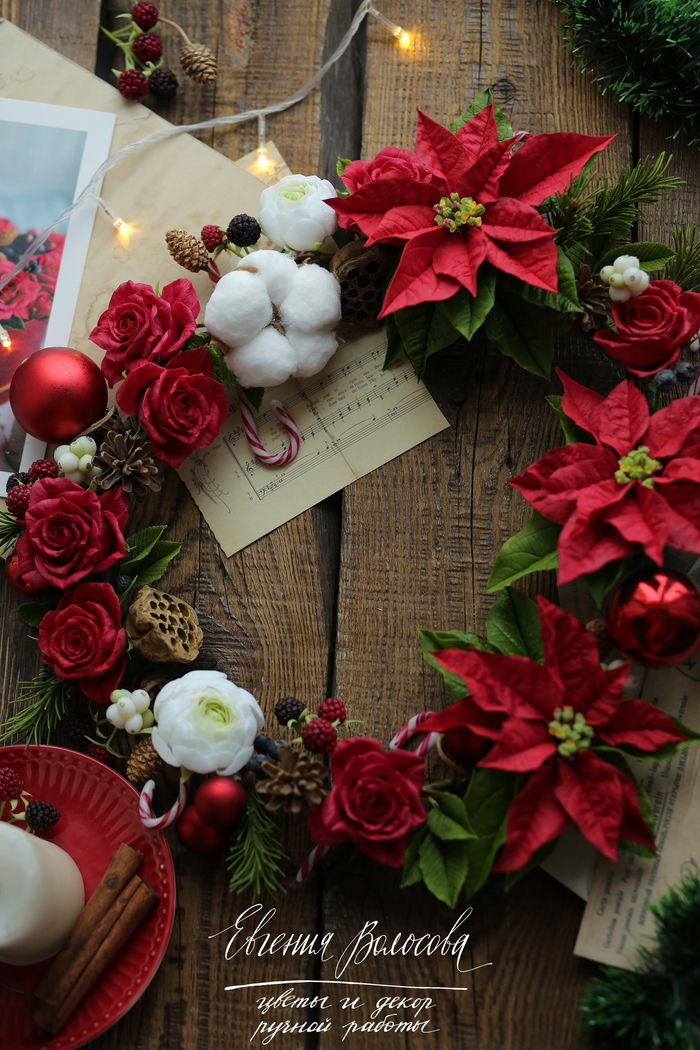 Всем здравствуйте, хочу показать вам свою последнюю работу в этом году. Все детали моего новогоднего веночка (кроме ёлочных шаров) выполнены из полимерной глины (холодного фарфора), тонировка масляными красками ❤️