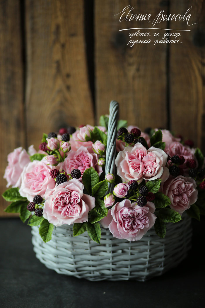 Всем здравствуйте, я к вам с новым букетом ручной работы. Честно пыталась лепить небольшие композиции, но неожиданно как-то получилась крупная корзина с английскими пионовидными розами и ежевикой. Цветы и ягоды слеплены из самозастывающей полимерной глины (тайский и японский холодный фарфор), тонированы масляными красками. Для понимания размеров я сняла небольшое видео с букетом в руках (заранее простите мой унылый внешний вид, мигрень несколько дней подряд пыталась меня запобедать)