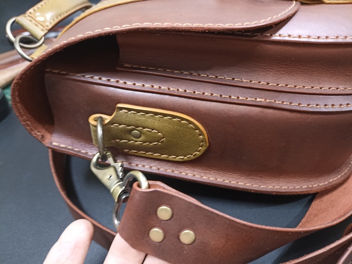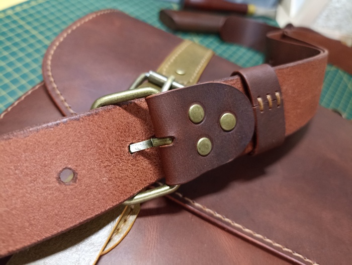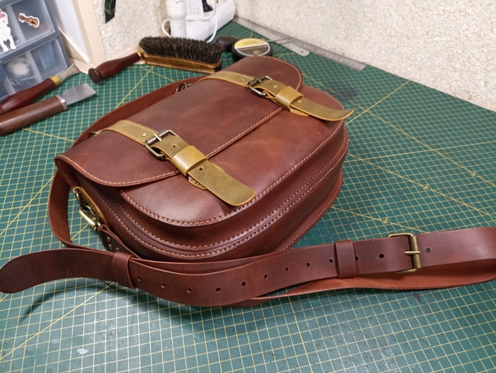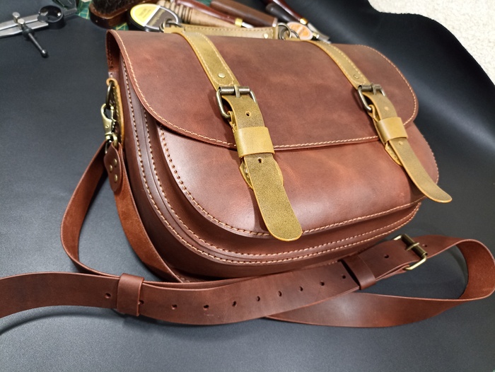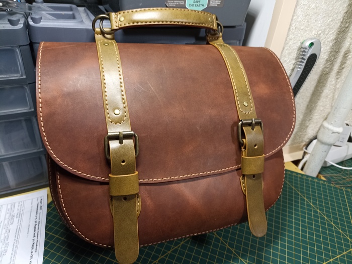 Сумка выполнена из твердой кожи хромового дубления в толщине 1.8мм, форму держит отлично. Шаг пробойника 5мм, нить 0.50мм. Финишно кожа обработана масловоском. Урезы обработаны токонолом и воском. На удивление, сумка получилась лёгкая, хотя кожа достаточно толстая. Сумка выполнена по бесплатной выкройке, честно скачанной с просторов интернета)