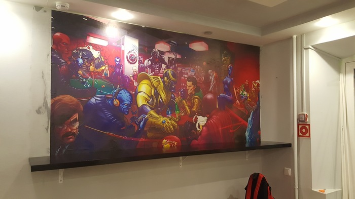 Едем далее....Стилистика определилась по мере стройки.И решили будет стилистика марвела. Заказали печать фотообоев и наклейку на вывеску которую купили вместе с хоолдильник