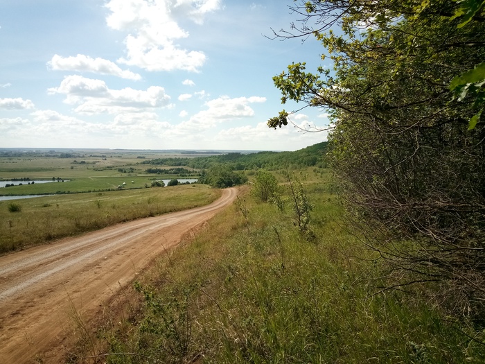 Срезал через поле и сэкономил 4 км. Пока спускался с горы пожалел что на лесапеде примитивные колодочные тормоза, к тому же ещё самодельные. Тут бы пригодились дисковые.