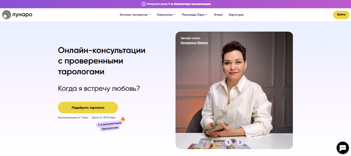Lunaro — 1-я консультация онлайн бесплатно! Проверенные специалисты с ценой от 70 р/мин. Быстрый фильтр тем любовь | деньги | карьера, честная гарантия возврата и удобный тайм-слот для личного приёма гадалки через видео.