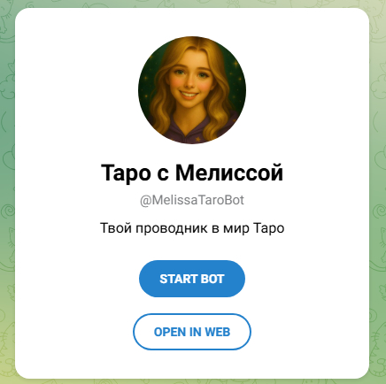 Таро с Мелиссой — Telegram-бот, где можно погадать на таро: бот собирает онлайн гадание расклад за несколько секунд, даёт возможность задать вопрос гадалке и сохранить результат в избранное.