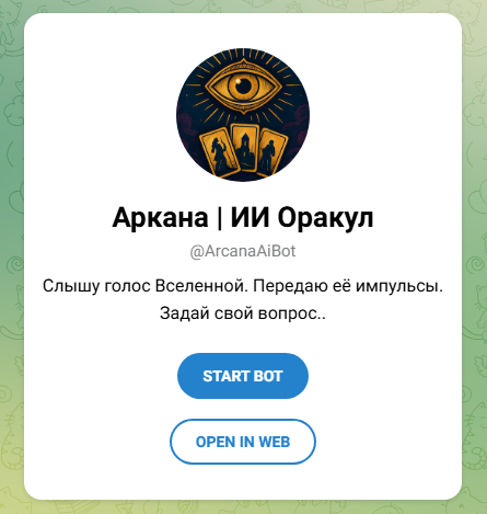 Аркана | ИИ Оракул — цифровой оракул в чате предлагает помощь гадалки онлайн, позволяет обратиться к гадалке круглосуточно и ведёт дневник всех раскладов для анализа.