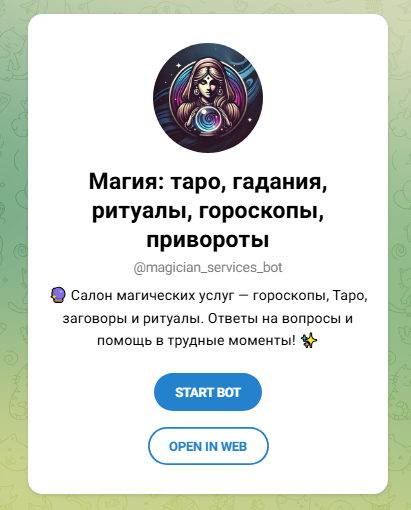 Многофункциональный Telegram-салон, объединяющий Таро, ритуалы, обряды отношений и персональные гороскопы. Комбинирует автоматические расклады на ИИ с возможностью заказать живой ритуал у приглашённого мастера. Меню разбито по целям: любовь, защита, карьерный рост, очищение.