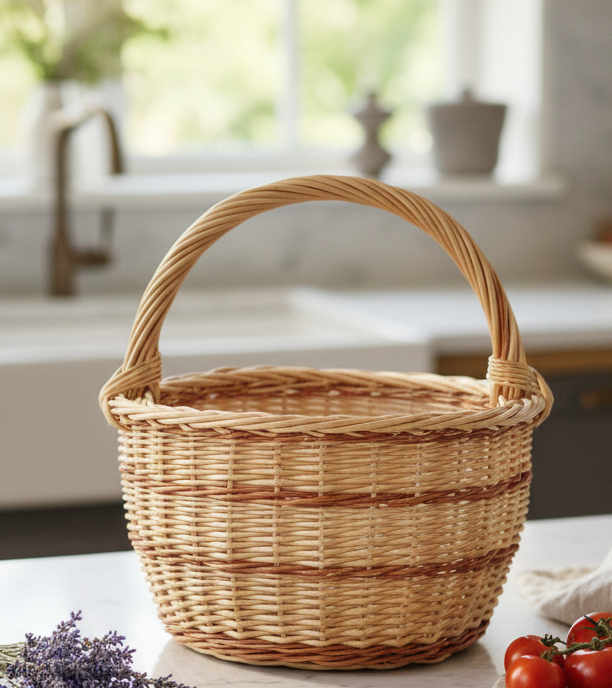 Размер может быть и очень большой, и необычно( по крайней мере для меня ) уменьшенный. На фото, в руках у мальчика небольшая монастырская( лучок) корзина. Такое соотношение ширины– высоты, довольно необычно. На столе стоит большая корзина, сплетённая узелком. Насколько могу разглядеть, изготовленная из корня сосны, причём и основа и оплётка. Мы же делаем небольшие размеры, чтобы не переводить материал. И естественно не из корня.